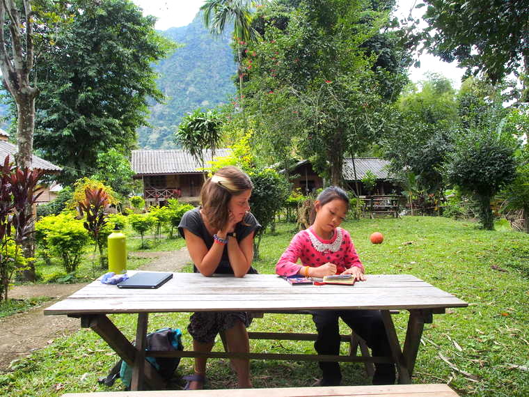 La journée, on travaille un peu et le soir on a juste à faire quelques mètres dans la rue de Muang Ngoi pour aller manger un bout. C’est ça la vie non ? Attention, puisque Muang Ngoi est un peu paumé, la wifi n’est parfois pas au rendez-vous mais c’est aussi le cas pour l’électricité et l’eau (nous n’avons pas pu nous laver pendant 2 jours. C’est ça la campagne ! :)).