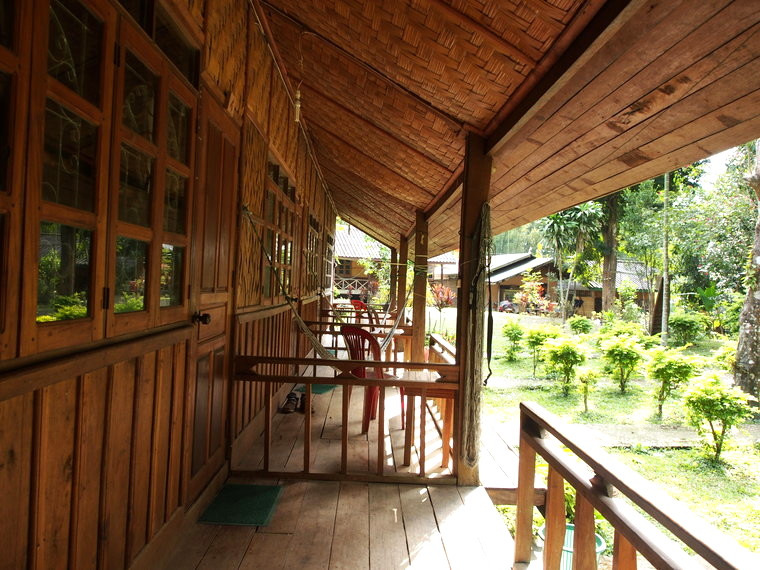 Nous avons fini par atterrir par hasard chez « Alone Mai Guest House » que l’on vous conseille vivement. Ce sont des petits bungalows en bois, en mode ranch, pas si petit que ça d’ailleurs construits au milieu d’un grand jardin tout vert rempli de végétation. Comme quoi, pas besoin de la Nam Ou pour être heureux ! À peine arrivés, Greg a déjà squatté le hamac, et il ne quittera plus pendant presque 3 jours ! Le matin, on se lève avec le son de la nature : la petite rivière, les poules, les chiens et les animaux non identifiés. Du beau monde quoi !