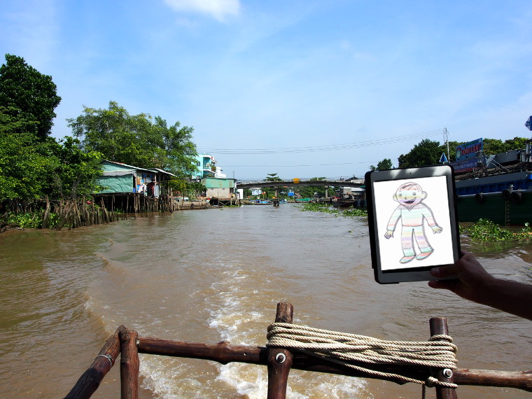 Le Bonhomme de Maxence fait un tour de bateau dans les méandres du Delta du Mékong au sud du Vietnam. Le Mékong est le dixième plus grand fleuve du monde et le 4ème plus grand d’Asie.